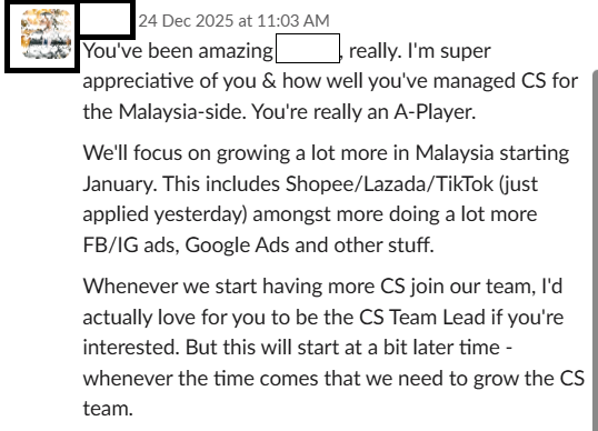 五个月(2025年10月至2026年2月),六千七百一十六笔订单,销售额将近两百万令吉,我一个人运作整个 CS department。